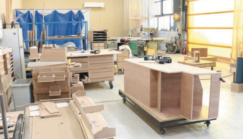 AWK工場内の一画にある木工場。今井さんは、ここで設計担当が作成した図面を基に材料を選定し、切り出し、加工・組み立て・微調整に至るまでを1人でこなしています。作業台や道具入れなども今井さんお手製です!