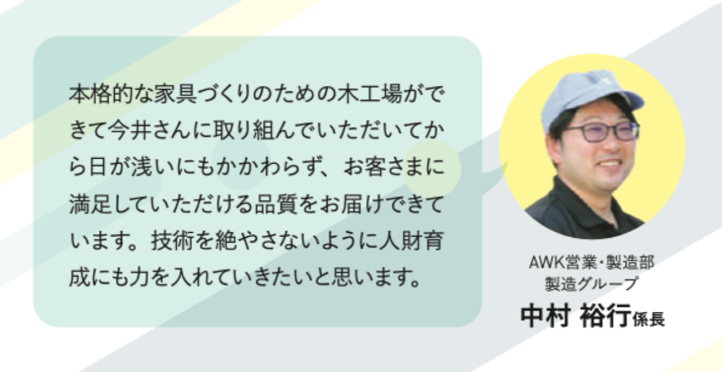 今、家具業界では、安価な大量生産か高額な特注品という二極化が進んでいます。一点モノで家具を外注しても採算が合わず、お客さまの細かい要望にも応えられないのが課題でした。そこでAWKでは、4年前に特装車専用工場として生まれ変わったのを機に、木工場を設立し家具の内製化を推進。